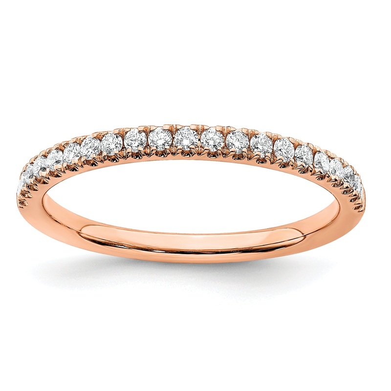 The 14k White Gold Rose Wedding Band Ring exudes elegance with its stunning combination of 15 round lab-grown diamonds totaling 0.18 carats and an additional 6 diamonds weighing 0.06 carats. Each diamond scores a clarity rating of VS/SI+ and a color grade