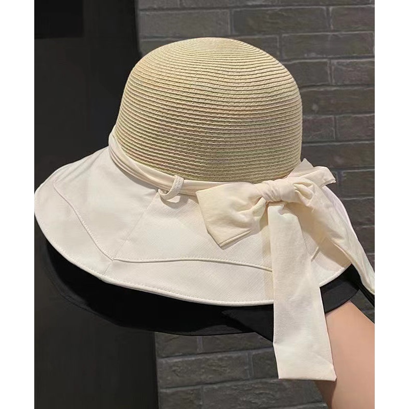 Classy White Patchwork Bow Lace Up Bucket HatMade of fine Cotton Blended Straw Woven.Hat Circumference: 58cm/22.62". Matches easily with daily hairstyle, dresses & Shirts