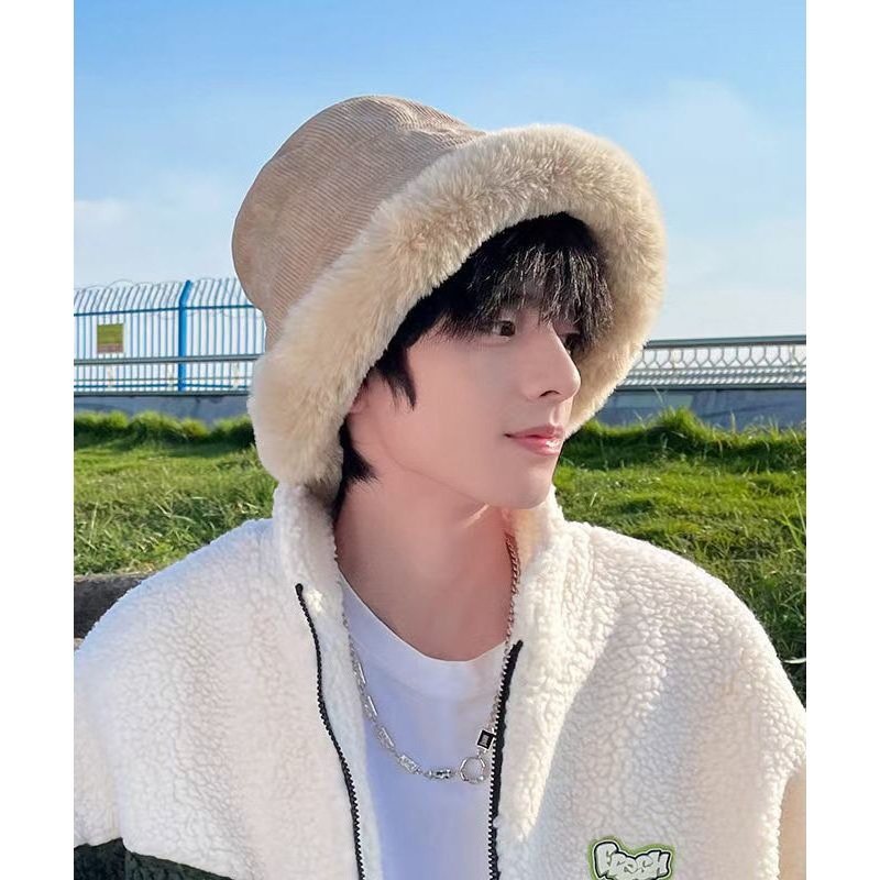 Fashion Khaki Thick Warm Fleece Men Bucket Hat