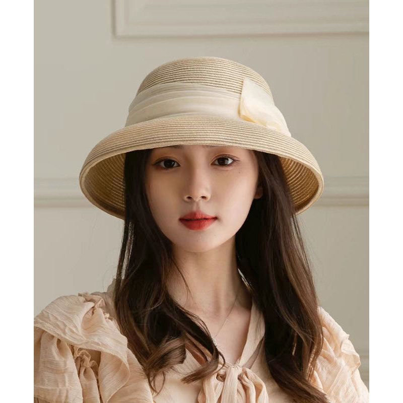 French Apricot Bow Straw Woven Bucket HatMade of fine Straw Woven.Hat Circumference: 58cm/22.62". Matches easily with daily hairstyle, dresses & Shirts