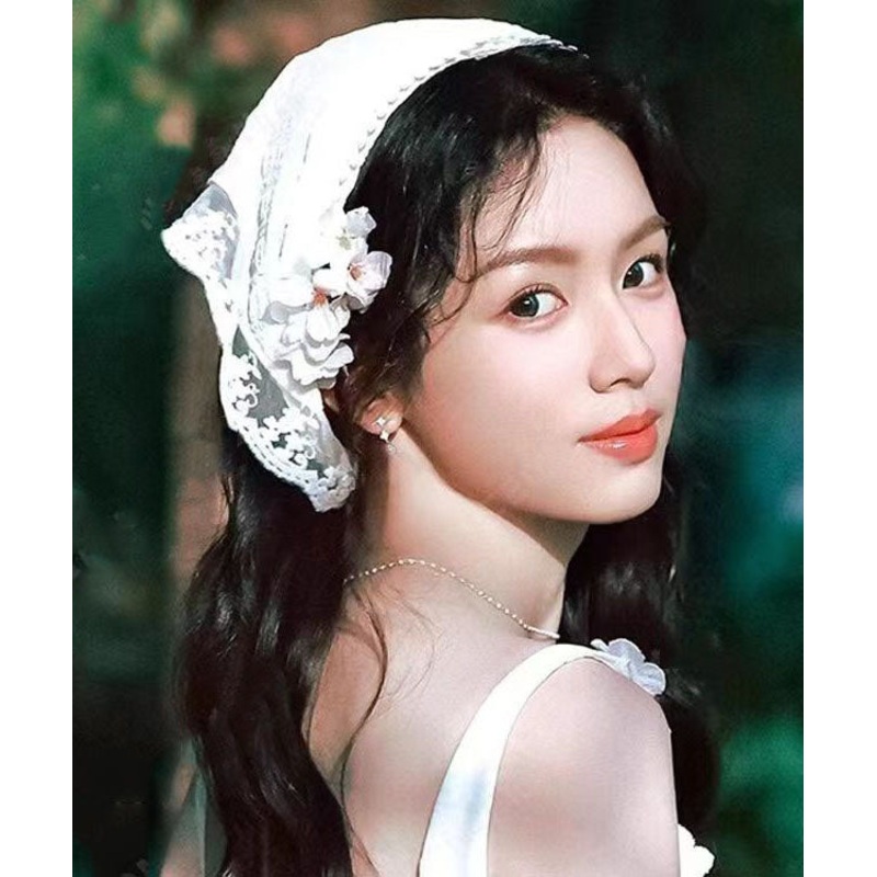 French White Pastoral Lace Floral Bun Triangular Hair Scarf