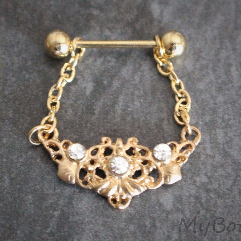 Dangle Nipple Ring Gold, 14g Nipple Barbell Bar, Victorian Body Piercing Jewelry,Dangling Crystal Shield, Hanging Chain, Tribal, Elegant