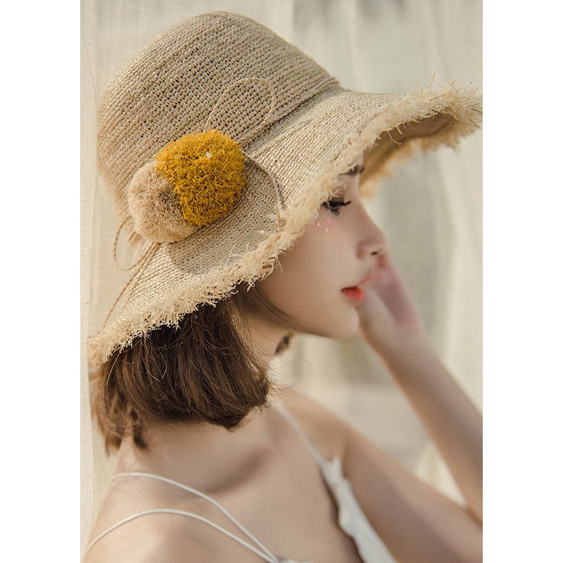 New Khaki Fuzzy Ball Decorated Foldable Straw Woven Bucket Hat