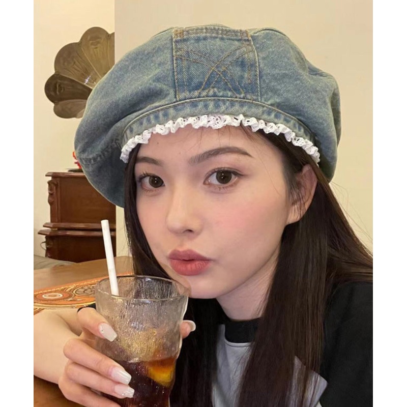 Original Blue Denim Lace Trimmed Beret HatMade of fine Denim Fabric.Hat Circumference: 58cm/22.62". Matches easily with daily hairstyle, dresses & Shirts