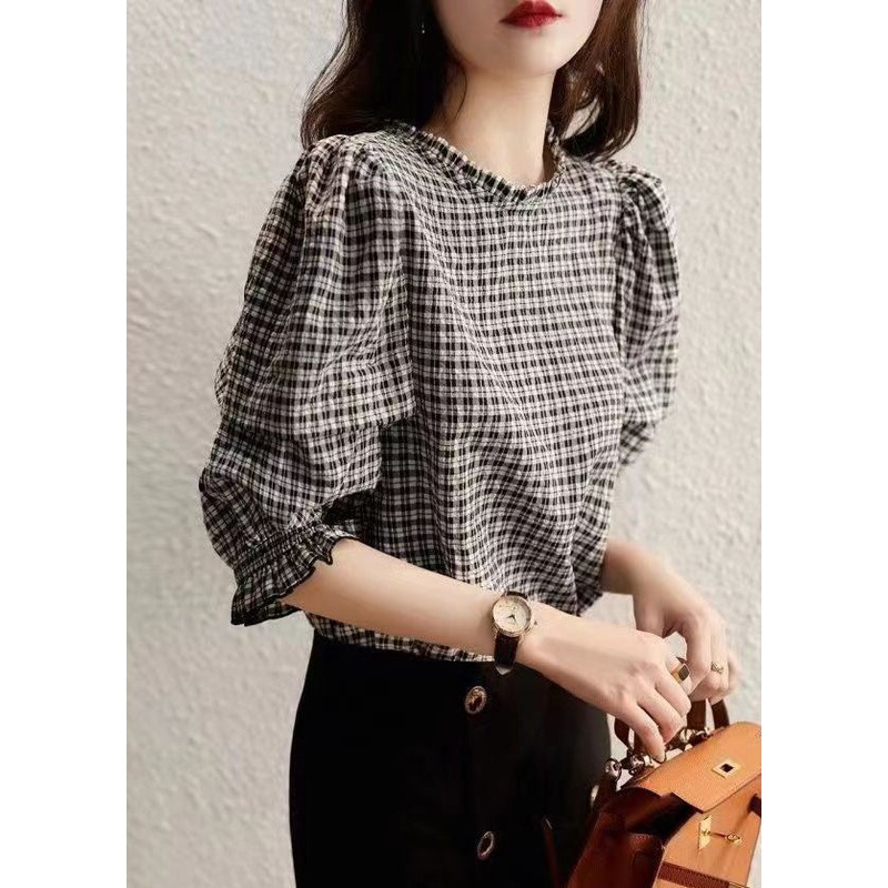 Stylish Plaid Ruffled Button Cotton Shirt Half SleeveFabric: Cotton 45%, Linen 55%Size & Fit: Fit: This garment fits true to size.Length: Size L measures 23.79"from shoulder to hemBust: Great for any cup size. Waist: Loose Fit. Comfortable room throughout